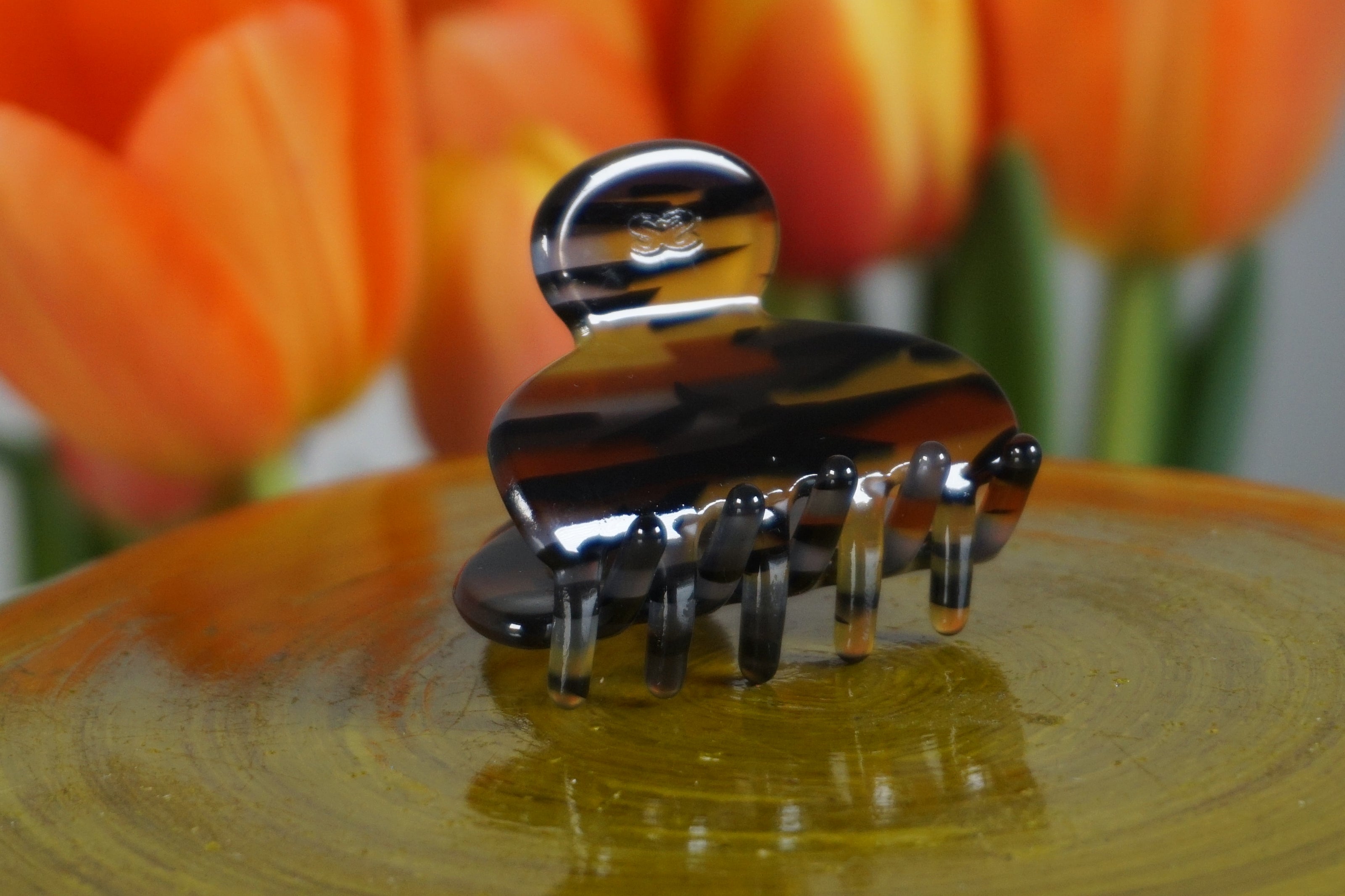Mit ihrer dunklen Maserung bringt die Crop-Klammer eine elegante, natürliche Note in dein Haarstyling. Ihre abgerundeten Spitzen garantieren angenehmen Tragekomfort – kein Drücken, kein Ziepen.