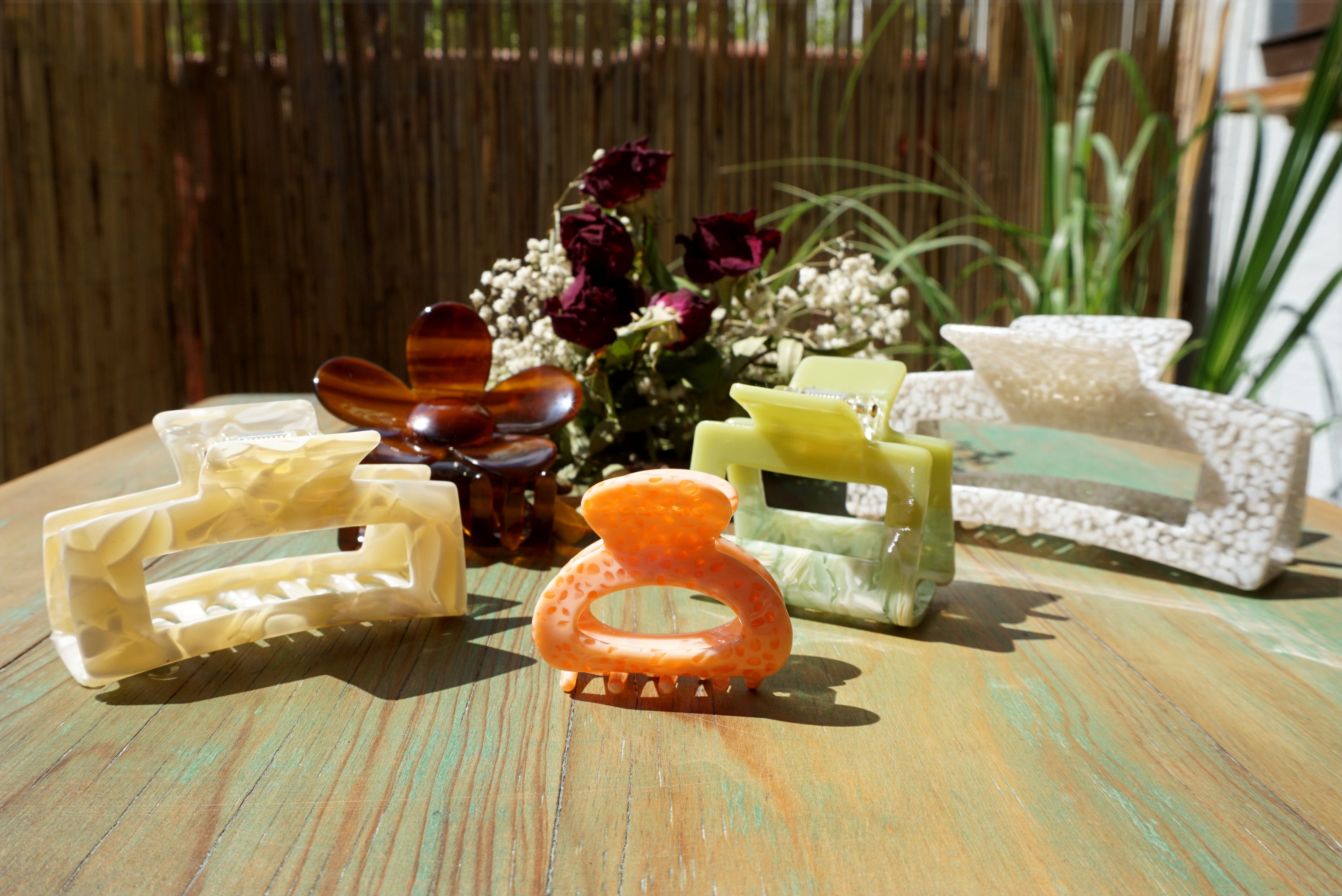 Die Haarklammer besteht aus Celluloseacetat, einem Biokunststoff, der aus nachwachsenden Rohstoffen wie Holz, Baumwolle und Obst- oder Gemüseresten gewonnen wird. Celluloseacetat hat sich durch Haltbarkeit und Stabilität bewährt, was höchste Qualität garantiert und dabei den Abfall reduziert. Die Farbe blättert nicht ab und es entstehen keine Kratzer. Durch den Produktionsprozess ist jede Haarklammer ein Unikat in Farbverlauf und Farbmaserung. Mit seiner natürlichen Haptik und Langlebigkeit vereint das Material Qualität sowie Umweltbewusstsein und verleiht der Haarklammer ihren einzigartigen Charakter.