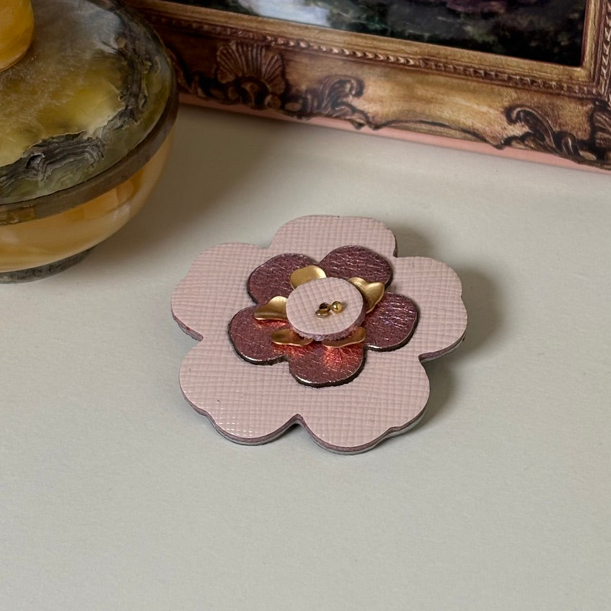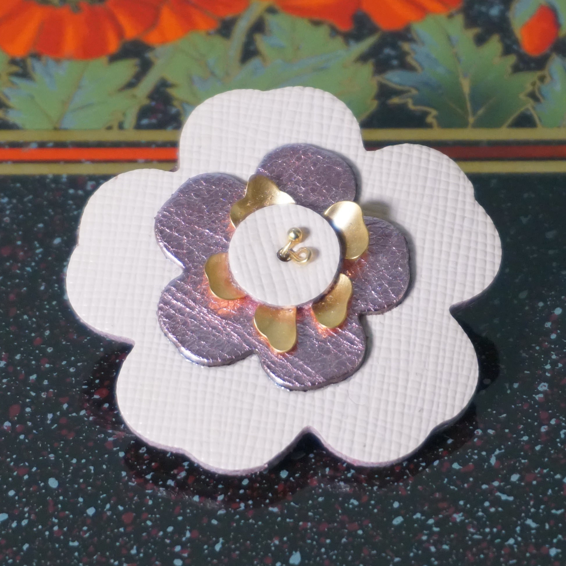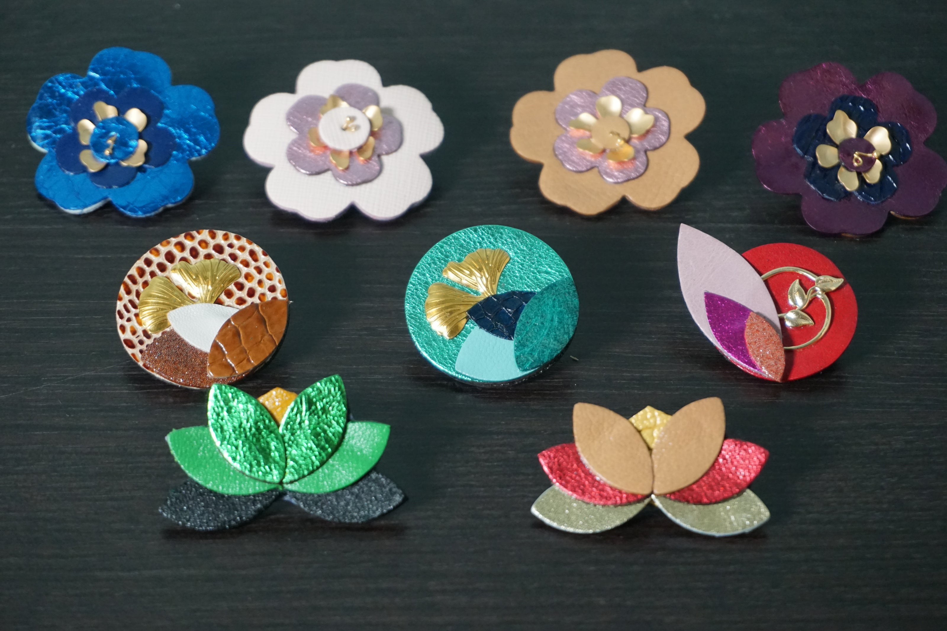 Jede Brosche ist ein Unikat, gefertigt aus hochwertigen Lederresten, die in der Modeindustrie übrig bleiben. Die Formen und Farben variieren leicht, genau das macht ihren Reiz aus.